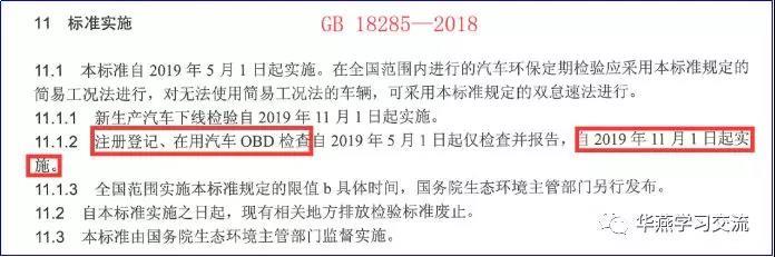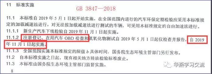 按照GB 18285—2018《汽油車污染物排放限值及測量方法(雙怠速法及簡易工況法)》和GB 3847—2018《柴油車污染物排放限值及測量方法(自由加速法及加載減速法)》的要求,汽油車和柴油車注冊登記、在用汽車OBD檢查自2019年11月1日起實(shí)施。